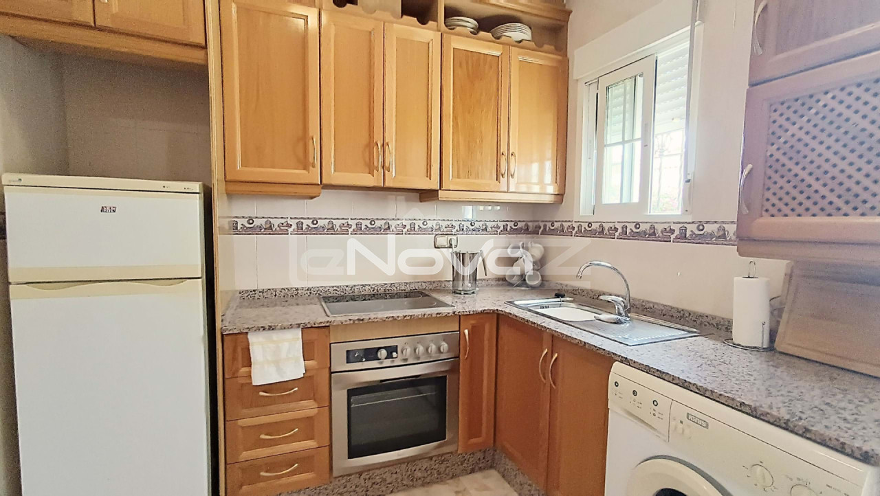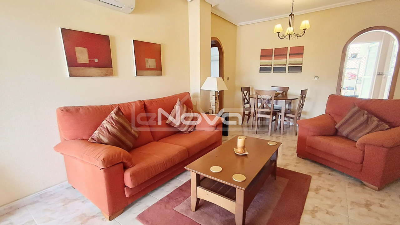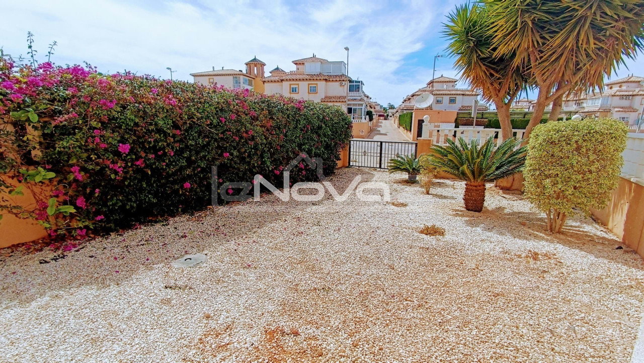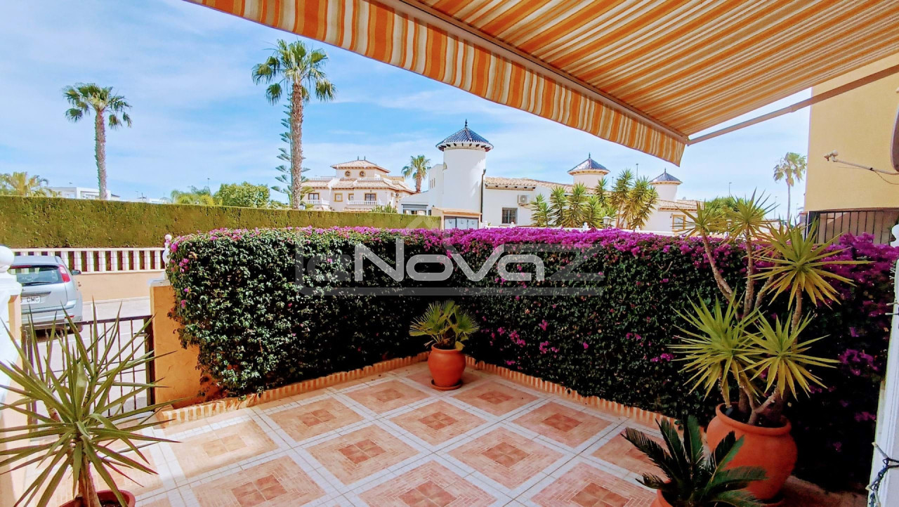 We are delighted to present this ideal oasis within this ground-floor apartment, situated in the heart of Lomas de Cabo Roig. Only a short stroll from two vibrant hubs, a short drive from the nearest beachfront as well as being surrounded by the stunning countryside of Orihuela Costa. Step into serenity as you enter through a welcoming low-maintenance garden, leading to a spacious front terrace, perfect for unwinding in your outdoor sanctuary. As you step inside, natural light dances through the airy living and dining area, enhanced by the comfort of air conditioning. The large sliding door beckons you to the front terrace, seamlessly blending indoor-outdoor living. Adjacent, a fully-fitted kitchen awaits, complete with a fridge freezer, offering convenience and functionality. A utility room, housing the boiler and equipped with a sink, provides additional practicality, with access to the back garden, offering potential parking space for residents. This haven features two double bedrooms, each adorned with fitted wardrobes, ensuring ample storage. These bedrooms share a newly renovated shower room, exuding elegance and comfort. Residents of this esteemed building enjoy exclusive access to a meticulously maintained communal pool, tucked away behind secure gates, providing a tranquil retreat for those sun-drenched days. Experience the epitome of relaxation and convenience in this immaculate abode, where every detail is crafted for refined living. Just 5 minutes by car is the La Zenia Boulevard Shopping Centre where you will find everything you need as well as all the services in the area. At the same distance is one of the most beautiful beaches on the Costa Blanca. And if you want to escape to the city of Alicante, in just 40 minutes you can be there and connect with other destinations thanks to its international airport, the AVE train station, and the bus station.