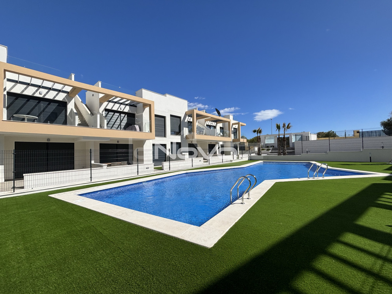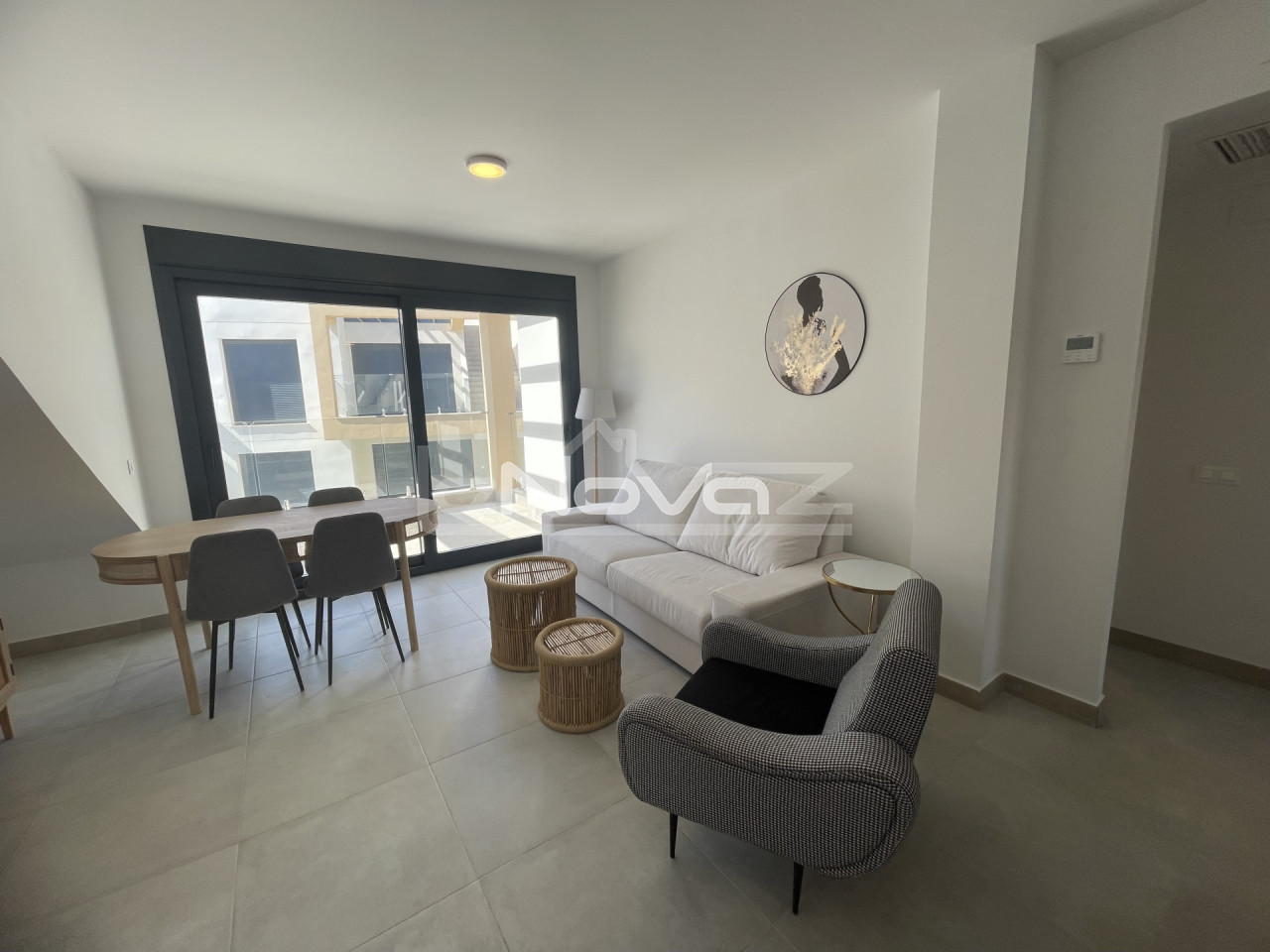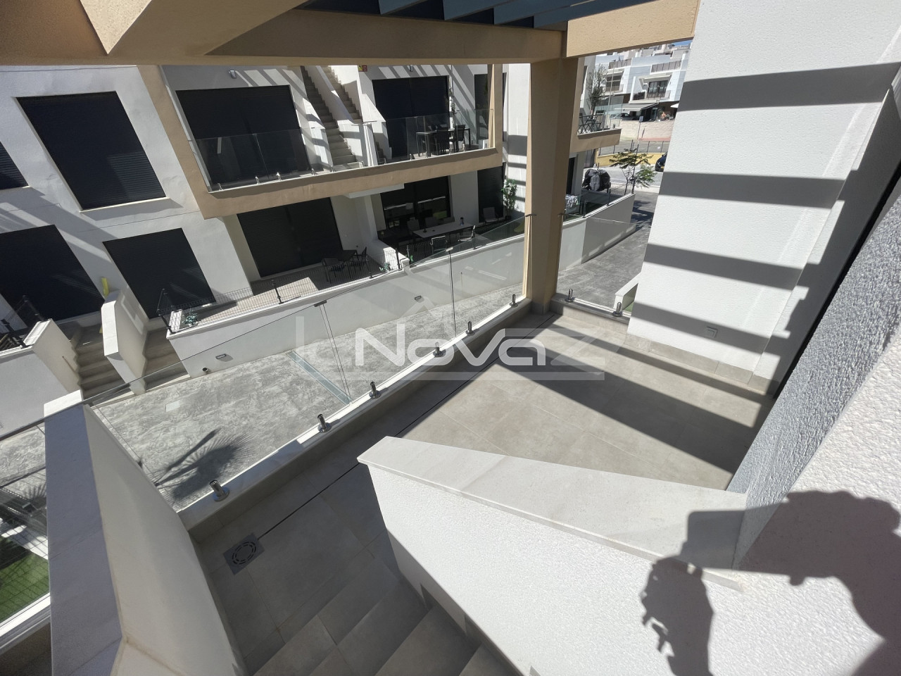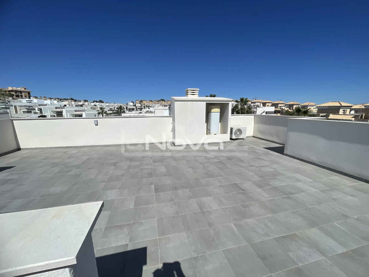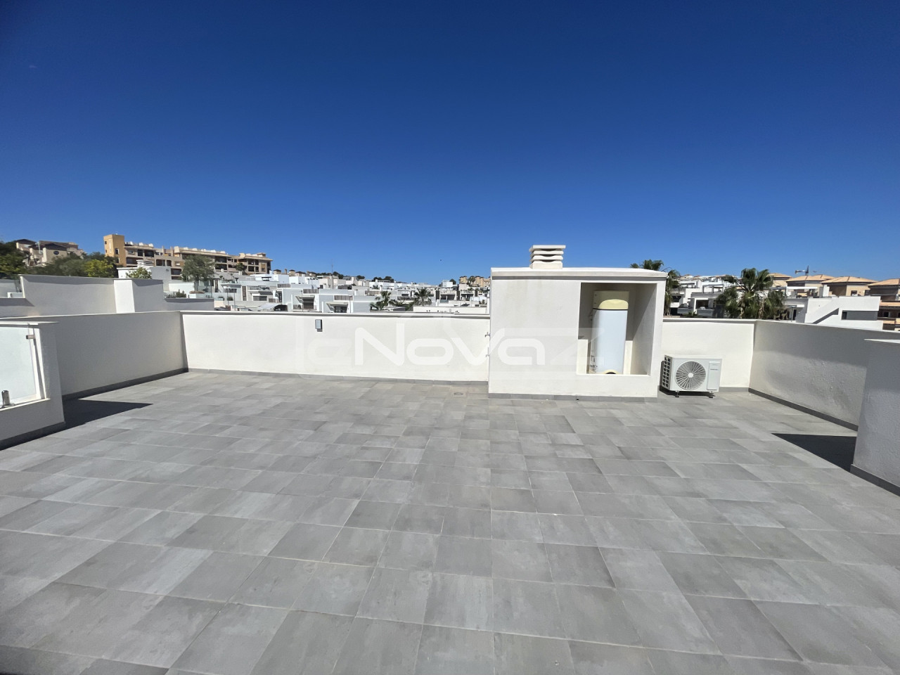 Modern new apartment with private solarium, located in the sought-after area of PAU 26, Orihuela Costa. The property is located on the top floor with independent entrance and features bright interiors, stylish design and excellent conditions for living and relaxing under the Mediterranean sun all year round. Orientation: South Community fees: 80 euros per month The apartment is partly furnished and ready to move into. It includes a spacious solarium with the possibility of installing a summer kitchen and a seating area, 2 bedrooms with built-in wardrobes, 2 modern bathrooms with underfloor heating, an open-plan kitchen combined with the living room and air conditioning for maximum comfort. Also included are white goods and an outdoor parking space. Residents of the complex have access to a communal swimming pool surrounded by green areas. Excellent location: close to supermarkets, cafes, golf courses, medical centers, the popular Zenia Boulevard shopping center and the magnificent beaches of Orihuela Costa.