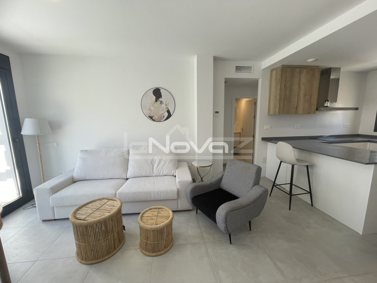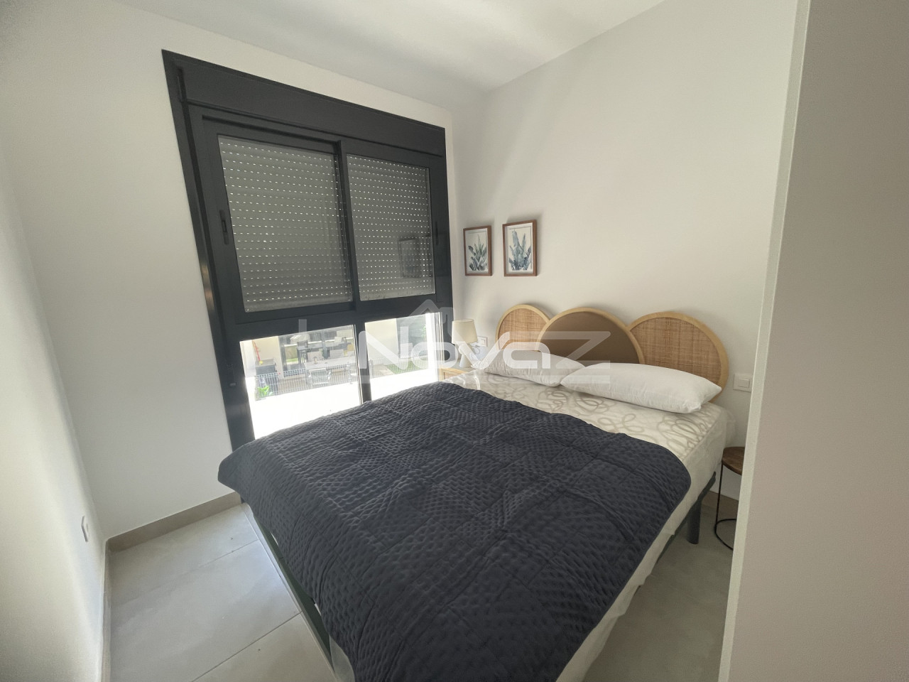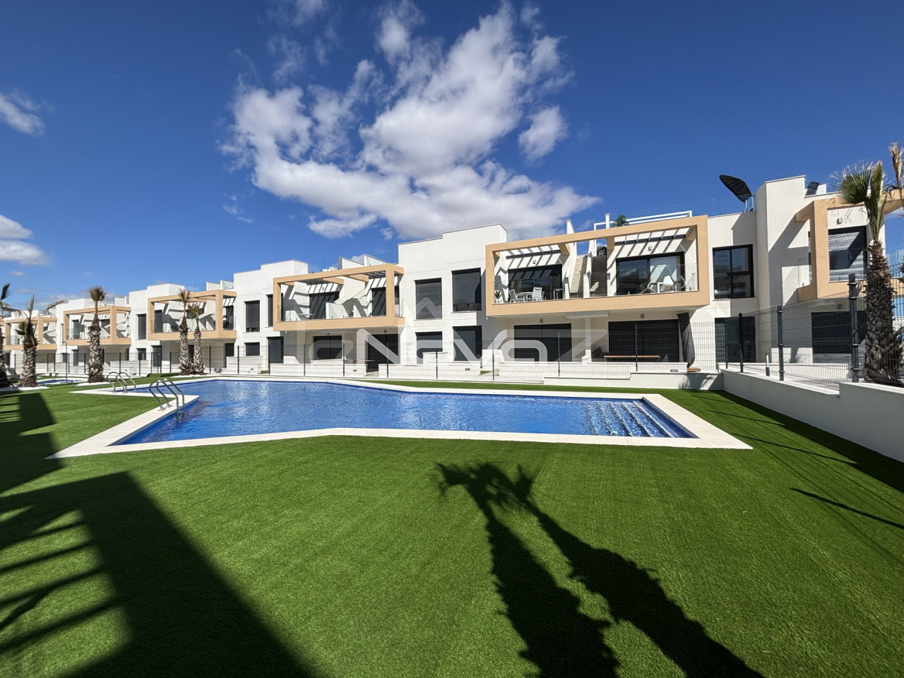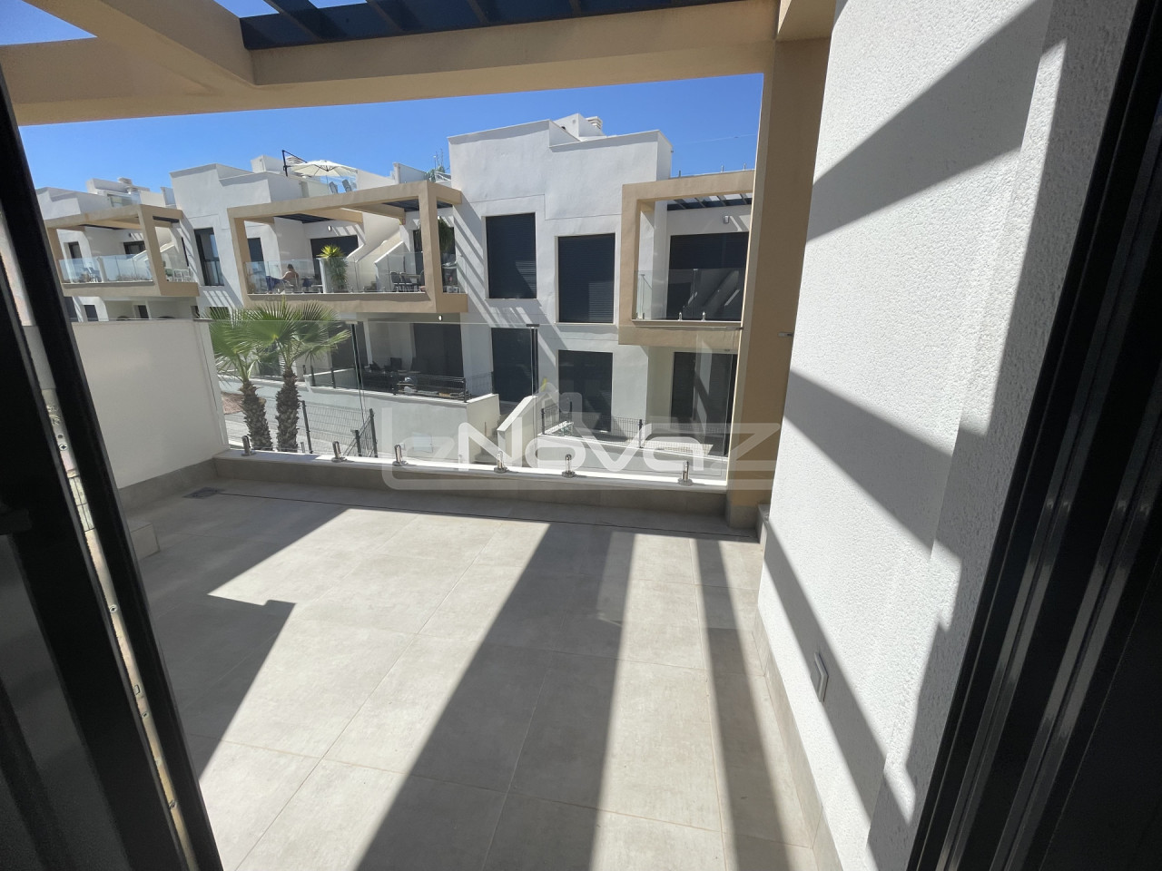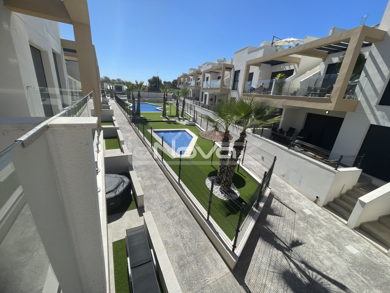 Modern new apartment with private solarium, located in the sought-after area of PAU 26, Orihuela Costa. The property is located on the top floor with independent entrance and features bright interiors, stylish design and excellent conditions for living and relaxing under the Mediterranean sun all year round. Orientation: South Community fees: 80 euros per month The apartment is partly furnished and ready to move into. It includes a spacious solarium with the possibility of installing a summer kitchen and a seating area, 2 bedrooms with built-in wardrobes, 2 modern bathrooms with underfloor heating, an open-plan kitchen combined with the living room and air conditioning for maximum comfort. Also included are white goods and an outdoor parking space. Residents of the complex have access to a communal swimming pool surrounded by green areas. Excellent location: close to supermarkets, cafes, golf courses, medical centers, the popular Zenia Boulevard shopping center and the magnificent beaches of Orihuela Costa.