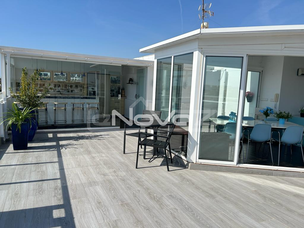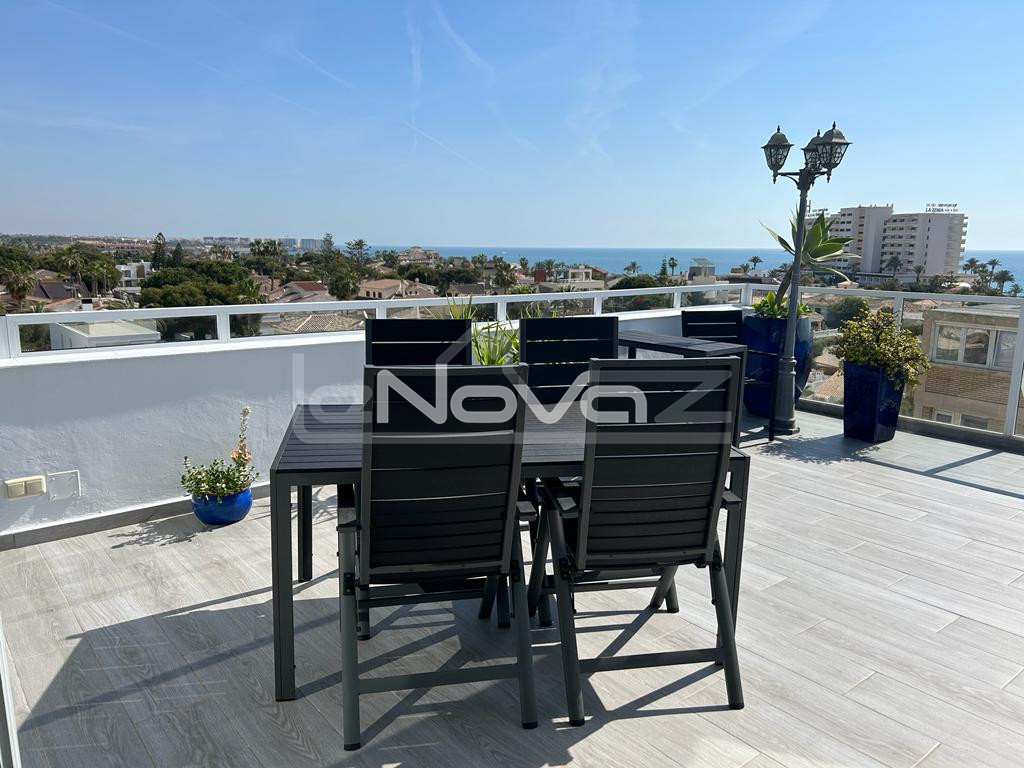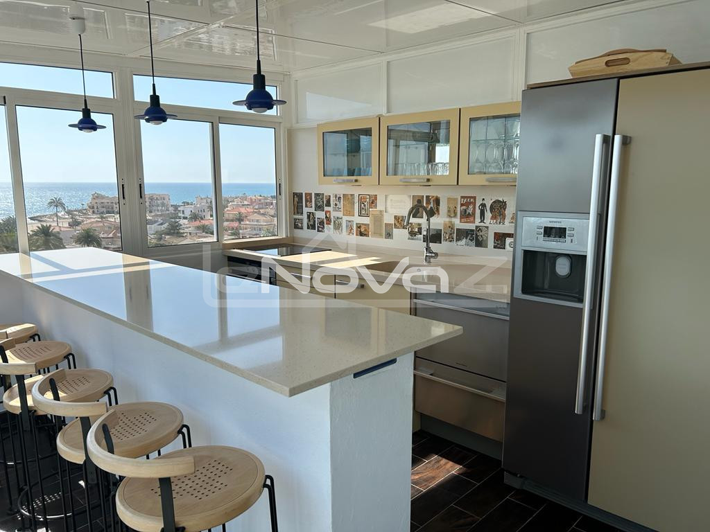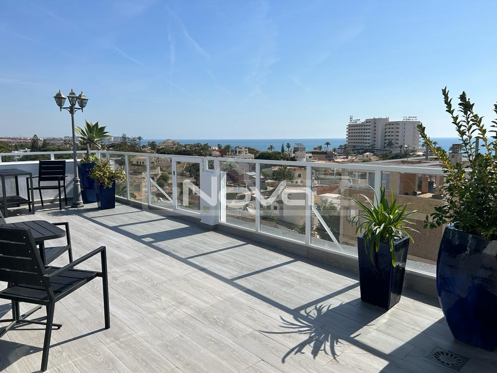 Incredible penthouse with 3 bedrooms, 3 bathrooms, huge solarium (100m2) with breathtaking sea views 200m from the beach in La Zenia. Incredible panoramic views of the Mediterranean Sea open from all windows and from the solarium terrace. The penthouse boasts an exceptionally comfortable designer layout. Upon entering the apartment, you are greeted by a stylish and functional entrance hall. Master bedroom with walk-in closet and en-suite bathroom with access to a spacious terrace with library area. On the other side of the hallway are 2 guest bedrooms and a guest bathroom. The living room is very bright and spacious, made in a classic style. The living room is divided into a fairly spacious dining area and a seating area that can accommodate even a very large family. The separate kitchen with a large window overlooking the pool is equipped with the latest technology and, in addition to everything you need, includes professional water purification equipment throughout the apartment. There is also a laundry area, which is hidden from prying eyes and opens when necessary. The pinnacle of perfection is the 100 m2 private solarium terrace, ideally designed for families and events. On this level, it is even possible to accommodate guests for the night, as there is a fairly large covered area with a pull-out sofa bed, a separate kitchen with appliances and a guest bathroom with a shower. As well as an impressive outdoor garden terrace with breathtaking views of the sea. Penthouse with an incredible location in the heart of the trendy resort of La Zenia, 3 minutes walk to the magnificent beach. A spacious swimming pool with sea water is open for residents of the house.