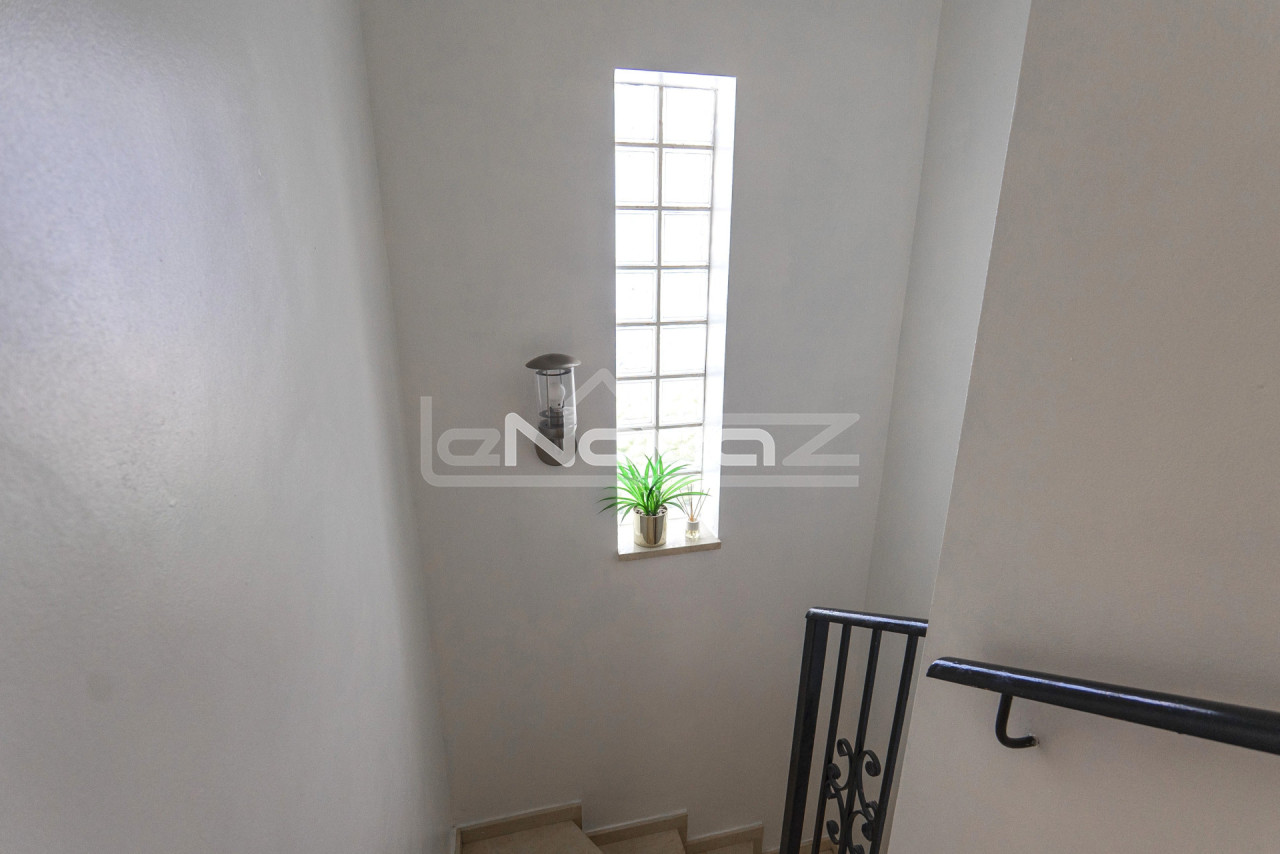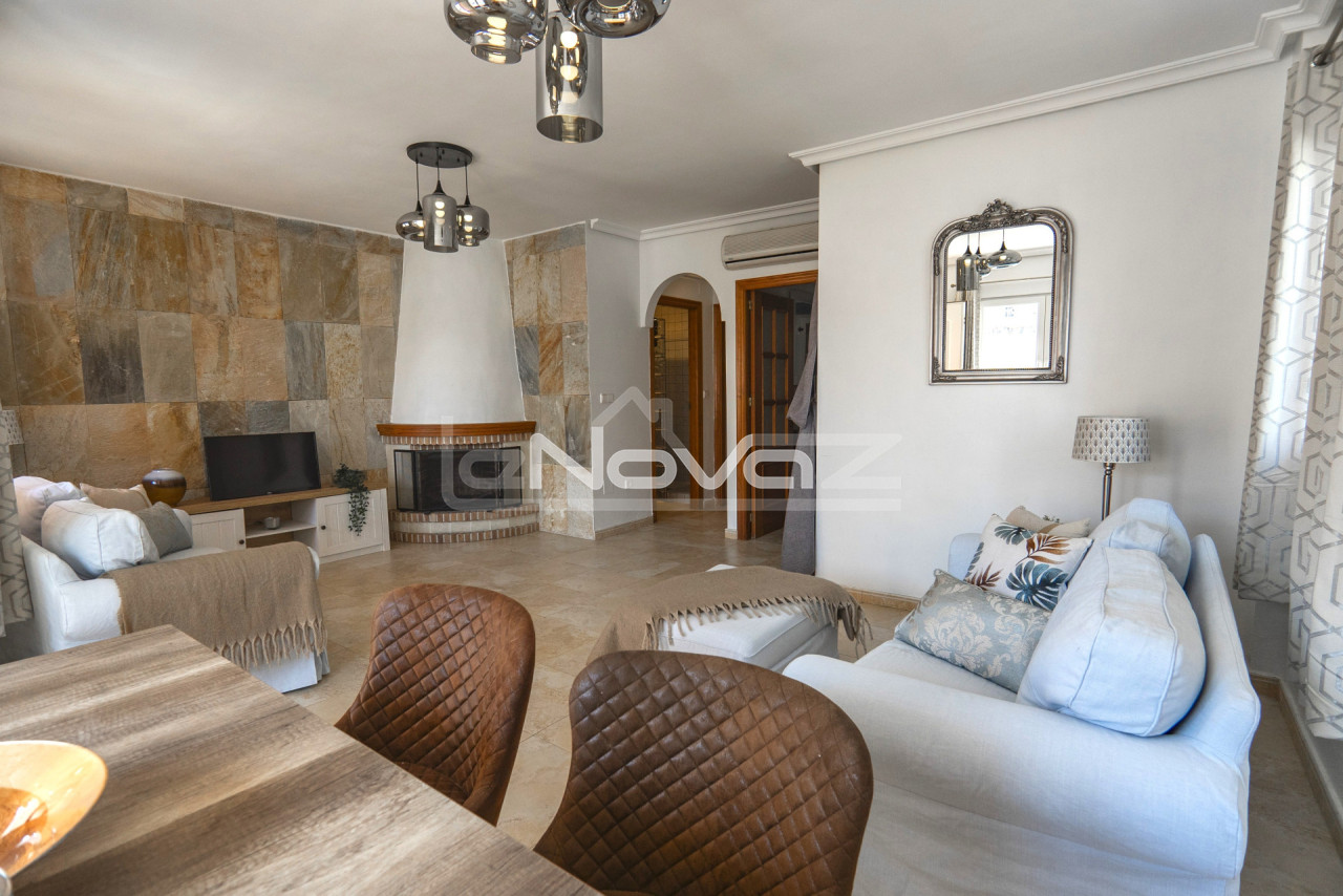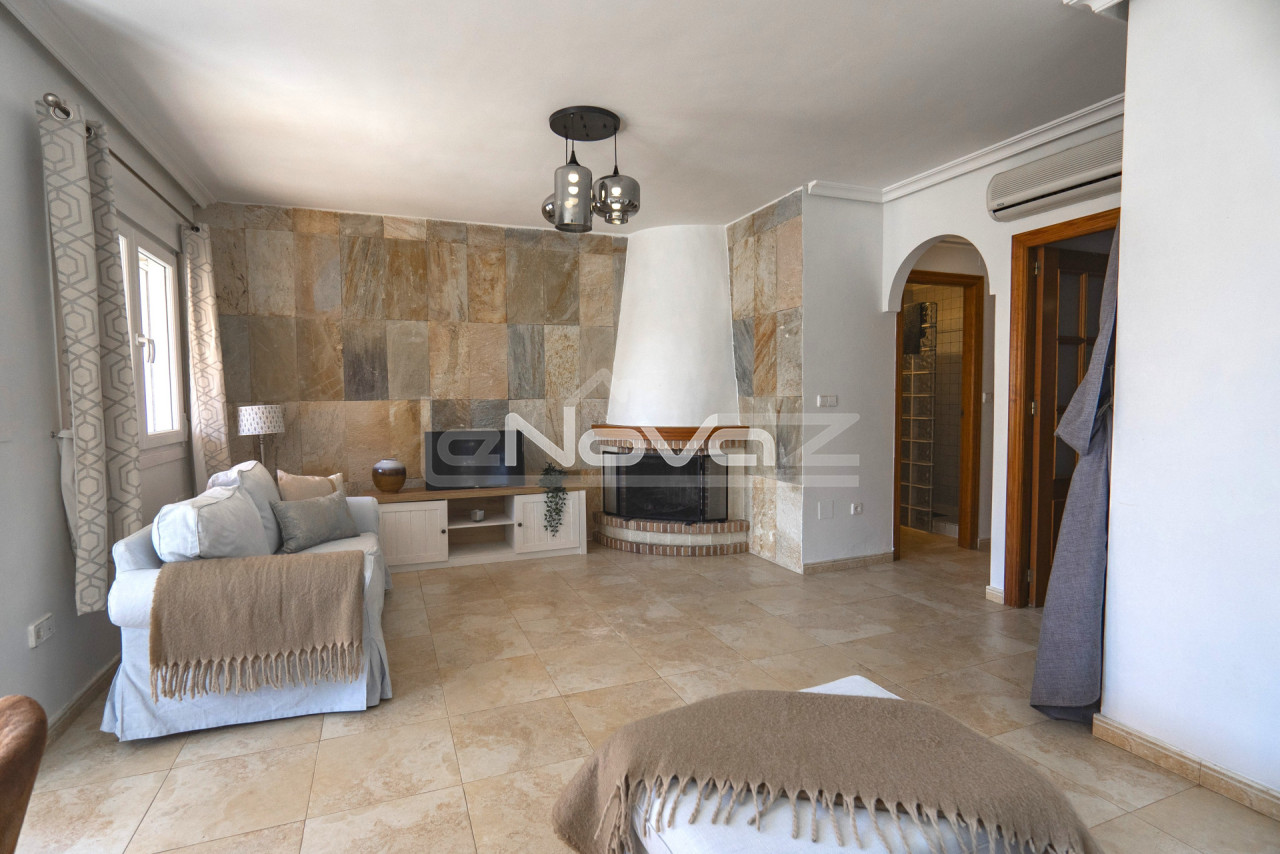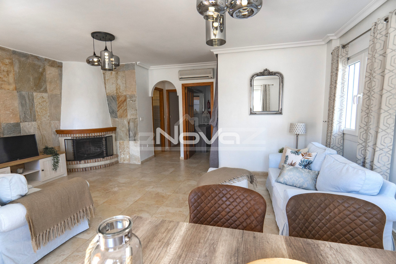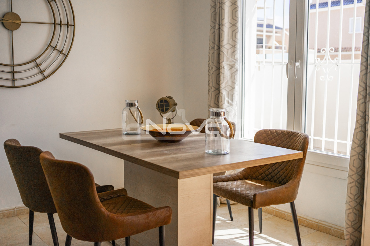 Eladó egy hangulatos, 106 m2-es villa egy 101 m2-es telken garázzsal, Lomas de Cabo Roig keresett környékén, mindössze 10 percre a strandoktól és a Zenia Boulevard bevásárlóközponttól. Gyalogosan elérhető üzletek, bárok és éttermek. A földszinten található egy világos nappali kandallóval és légkondicionálóval, egy hálószoba beépített szekrénnyel, egy modern fürdőszoba zuhanyzóval, egy különálló konyha és egy mosókonyha. A második emeleten két tágas hálószoba található teraszkapcsolattal és egy második fürdőszoba káddal. Minden hálószoba légkondicionált. A komplexum gyönyörű közös helyiségeket kínál: egy nagy úszómedence japán stílusú jakuzzival, zöld kertek, játszótér és egy szabadtéri edzőterem. Ideális állandó lakhatásra vagy nyaralásra. A villa teljesen berendezett és azonnal beköltözhető.