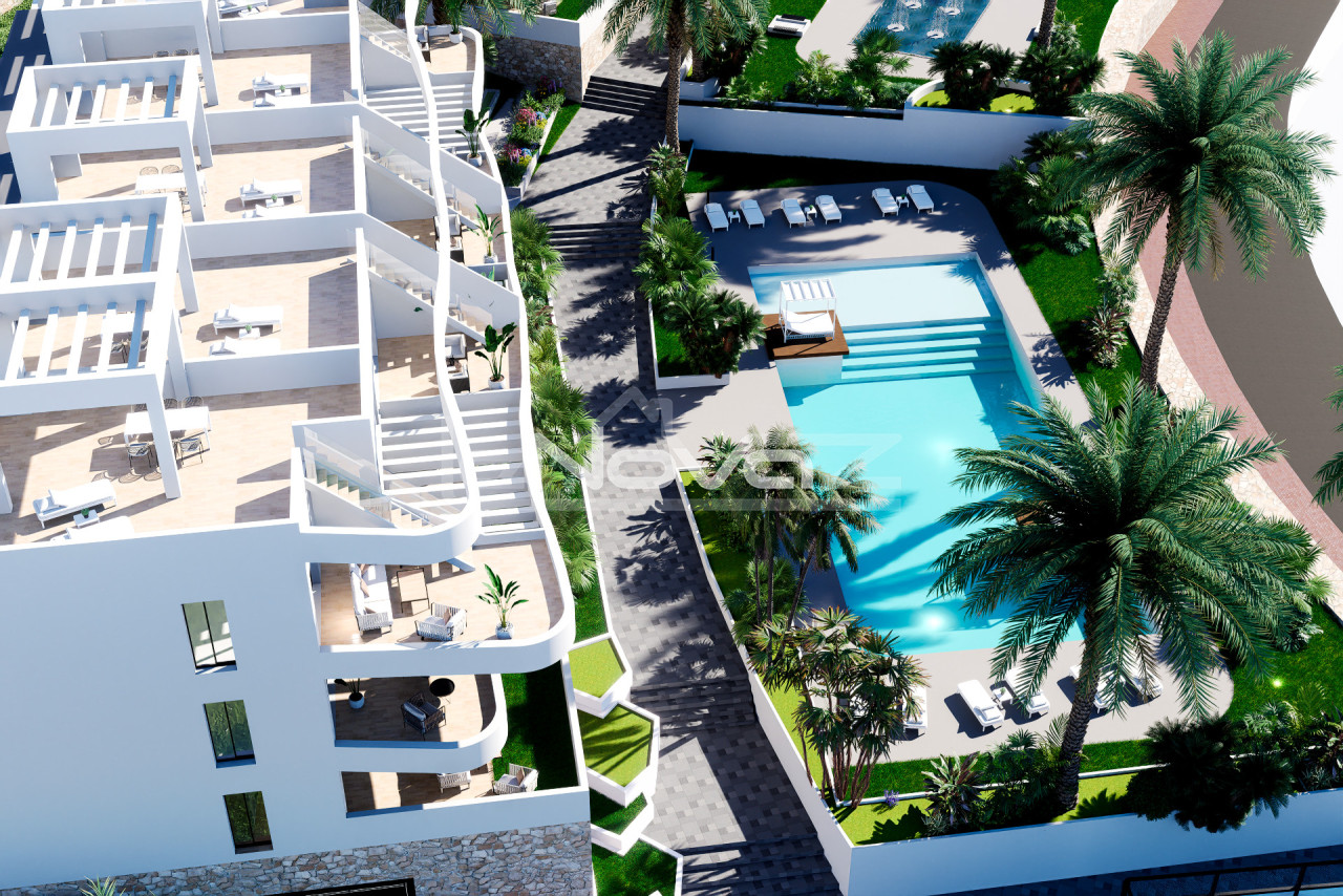 Ez a 2 hálószobás, 2 fürdőszobás apartman egy lakópark földszintjén Finestratban kínál kényelmet és életminőséget a Costa Blanca egyik legígéretesebb részén. Panorámás kilátást nyújt a tengerre, a városra és a Puig Campania-hegyre. Ez a helyszín ideális azok számára, akik a zajos turisztikai területektől távol a nyugalomra és a csendre vágynak, de ugyanakkor értékelik a mindennapi szolgáltatások könnyű elérhetőségét is: szupermarketek, éttermek, orvosi központok és Benidorm legjobb strandjai, mint például a Levante és a Poniente. A komplexum Finestrat néhány legtágasabb közösségi terével rendelkezik. Rendelkezésre áll gondozott kert, három úszómedence (köztük egy gyermekmedence), szolárium, modern gimnasztikai és biomechanikai részleg, egy paddle sportpálya és egy játszótér. A lakók kényelme és biztonsága érdekében elektromos járművek töltőállomásai, videómegfigyelés és biztonsági szolgálat állnak rendelkezésre. Mindez kiváló választássá teszi az apartmant mind állandó lakhatásra, mind a tengerparti szabadtéri kikapcsolódásra.