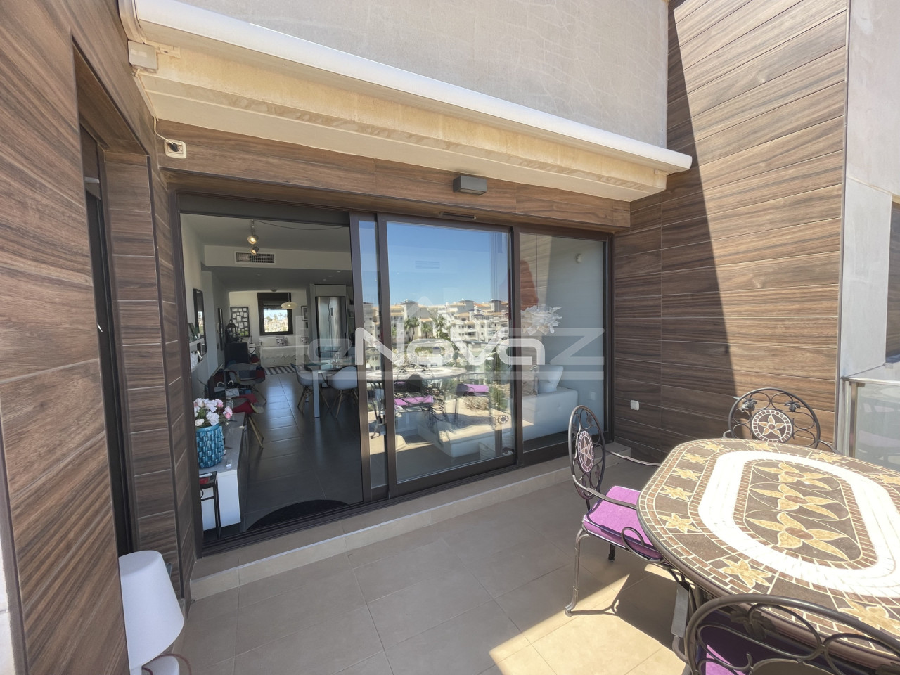 Unik modern takvåning med förstklassiga ytbehandlingar, belägen i den prestigefyllda Las Ramblas Golf Club, Orihuela Costa. Lägenheten på 90 m2 har 3 sovrum, 2 badrum, ett rymligt vardagsrum, två terrasser, ett solarium och ett garage. Fönster och terrasser erbjuder hisnande utsikt över havet och det gröna naturområdet. De boende har tillgång till två gemensamma pooler, samt rätt att använda de magnifika poolerna i bostadskomplexen Loira I, II och III. Byggnaden byggdes 2013 och är i utmärkt skick. Perfekt läge - bara några minuters promenad från köpcentret La Fuente med många restauranger, ett apotek och en busshållplats. I närheten - golfklubbarna Villamartín och Campoamor, och stränderna i Desa de Campoamor - bara 5 km bort. Området har också en yachtklubb, stormarknader, sjukvård, en tennisklubb och vackra parkområden. Ett utmärkt val för dem som söker elegant boende i ett lugnt, grönt område med utvecklad infrastruktur och närhet till havet.